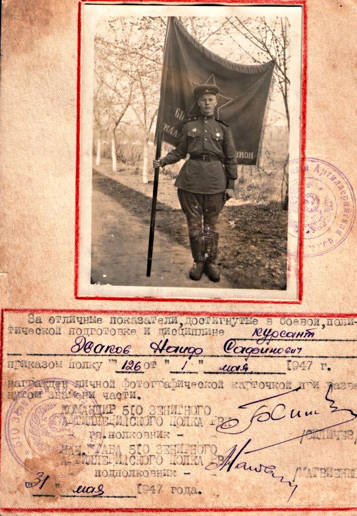 В ноябре 1944 года призывают в ряды РККА. Готовят его для фронта в Тоцке. Перед самой отправкой на фронт они получают распоряжение командования о том, что война близится к концу и приостановить отправку. Часть курсантов отправляют на Дальний Восток, к Японской границе. Хаков Наиф продолжает службу в отдельной роте артиллерийской части, обслуживающей научно-испытательный зенитно-артиллерийский полигон, на котором испытывали советские и иностранные зенитно-артиллерийские устройства (зенитные орудия, радиолокаторы, прожектора и др.) по Оренбургом. Служит Хаков Наиф добросовестно. Получает звание сержанта. За отличные показатели, достигнутые в боевой и политической подготовке и дисциплине курсант Хаков Наиф Сафинович приказом полка награждается личной фотографической карточкой при развернутом знамени части. А такая награда достается не каждому…
